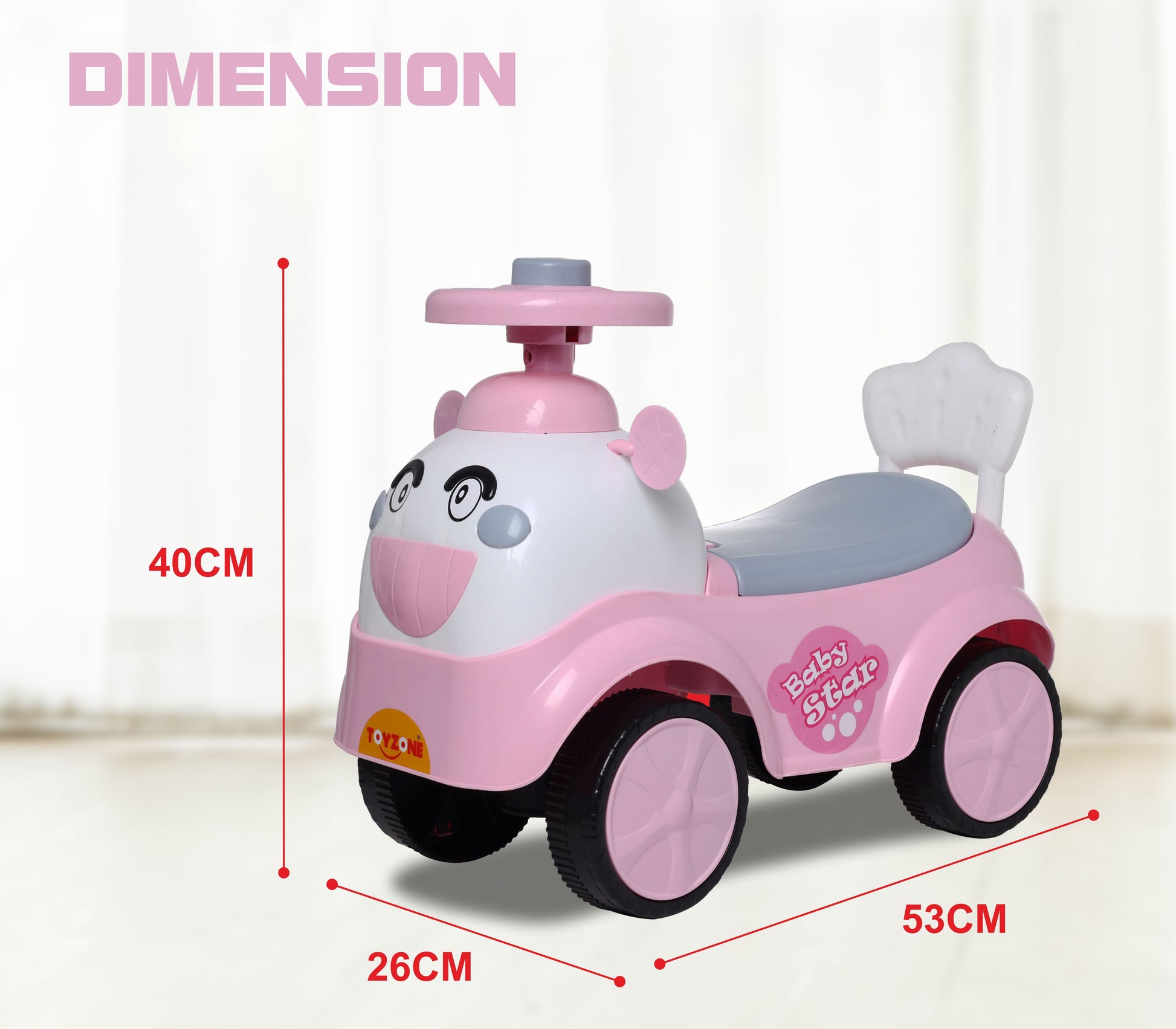The Baby Star Ride-on is the perfect toy for toddlers and young children who are ready to zoom around in style! This ride-on car offers both entertainment and comfort for kids 3 years and older. Equipped with a sturdy backrest for added safety and support, it ensures a secure and enjoyable ride. The built-in storage compartment is perfect for stashing toys or personal items, making it ideal for on-the-go adventures. With its easy-to-push design, this car encourages active play and helps develop motor skills and coordination. Whether it's for outdoor play or indoor fun, this adorable ride-on car will quickly become your child's favorite way to explore their world.